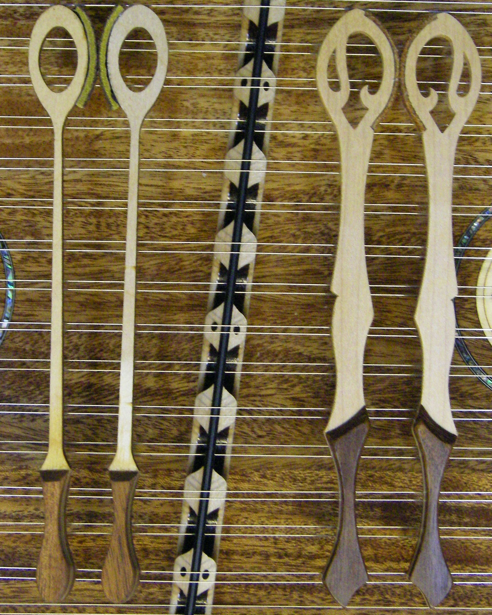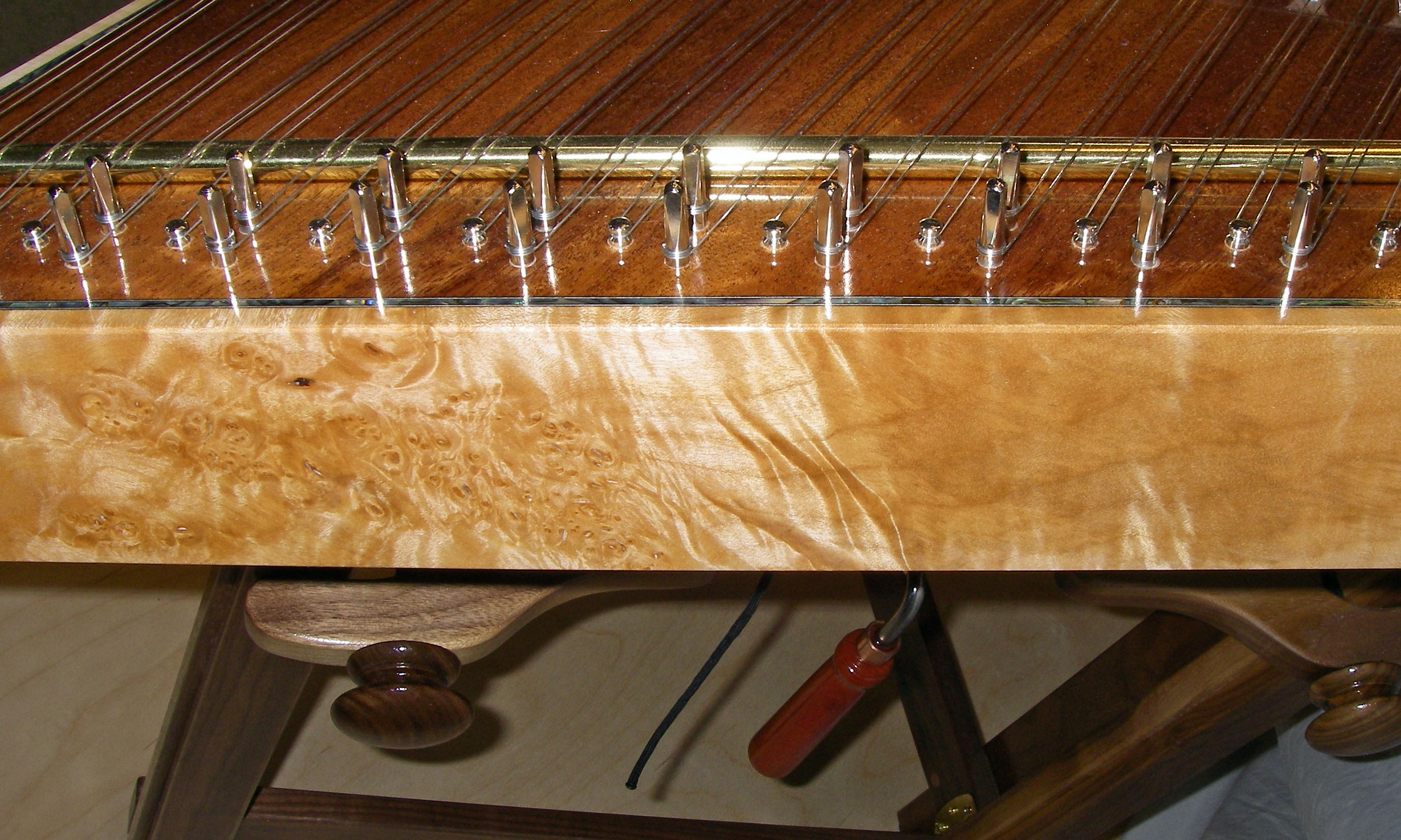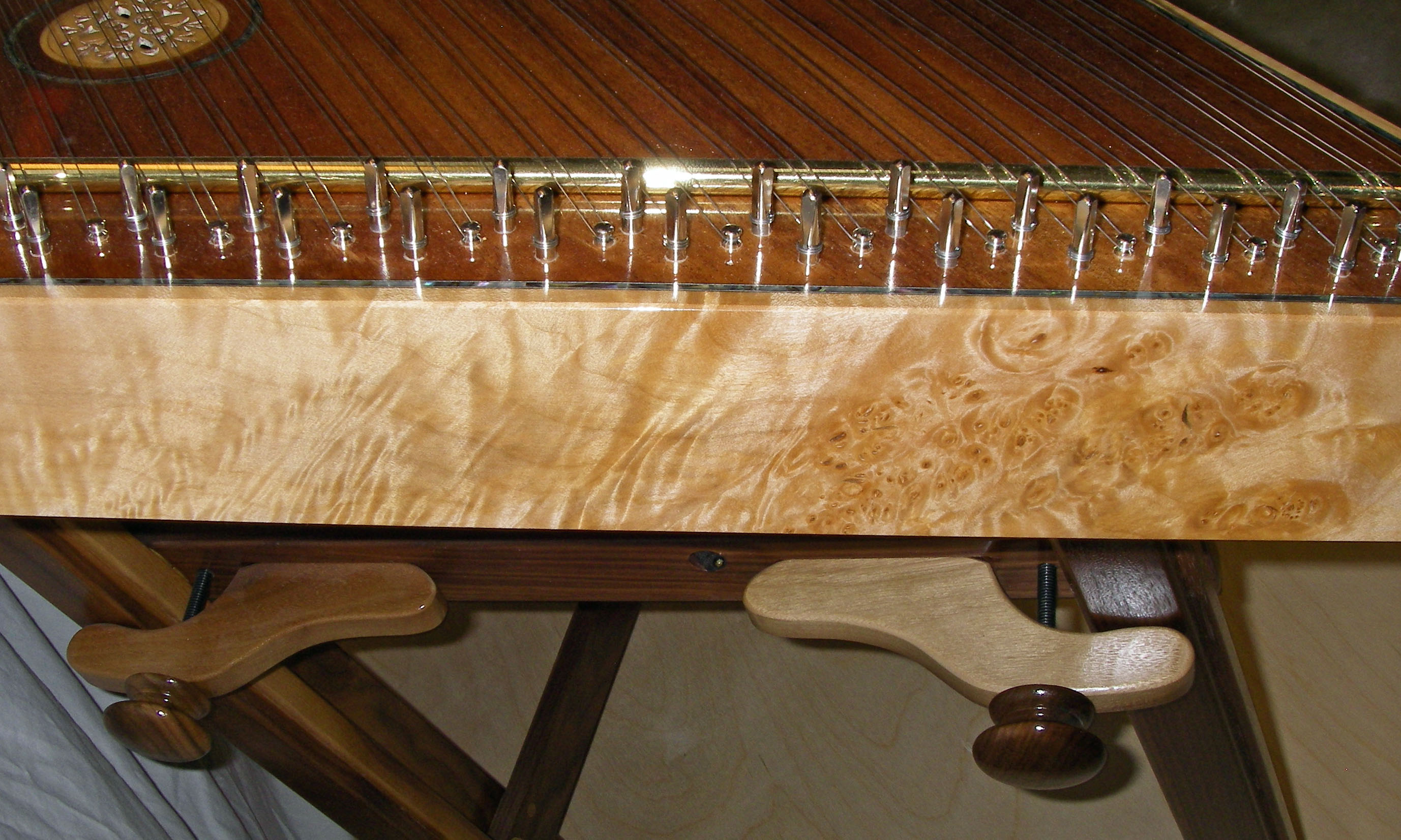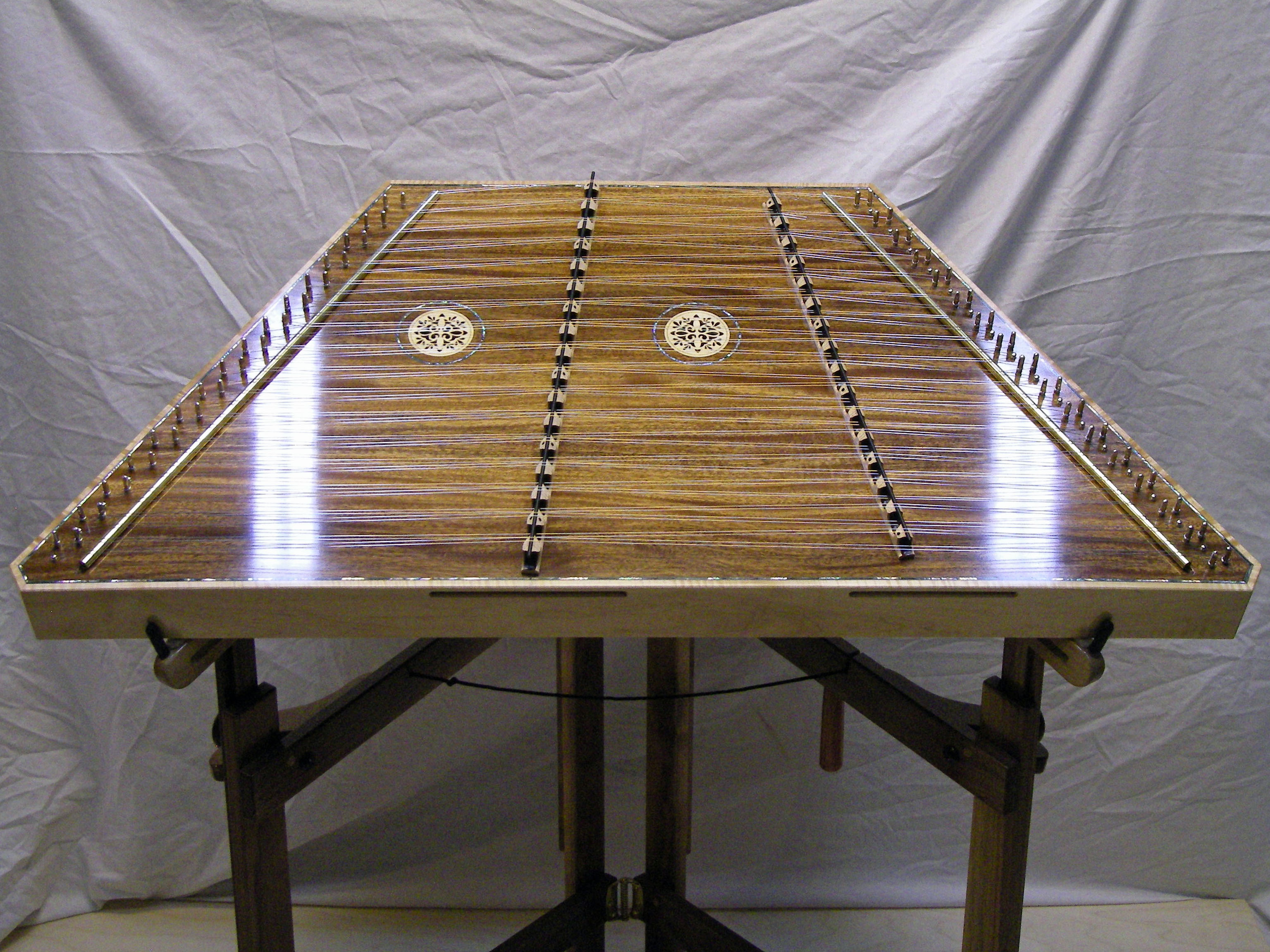 For Christmas this year 2009, I built Steph a Hammered Dulcimer based on a Musicmaker's Kits kit, with a stand built out of walnut from Musicmaker's plans. Also purchased from Musicmaker's, were a pair of upgraded hammers, two doily rosettes, and a padded case.