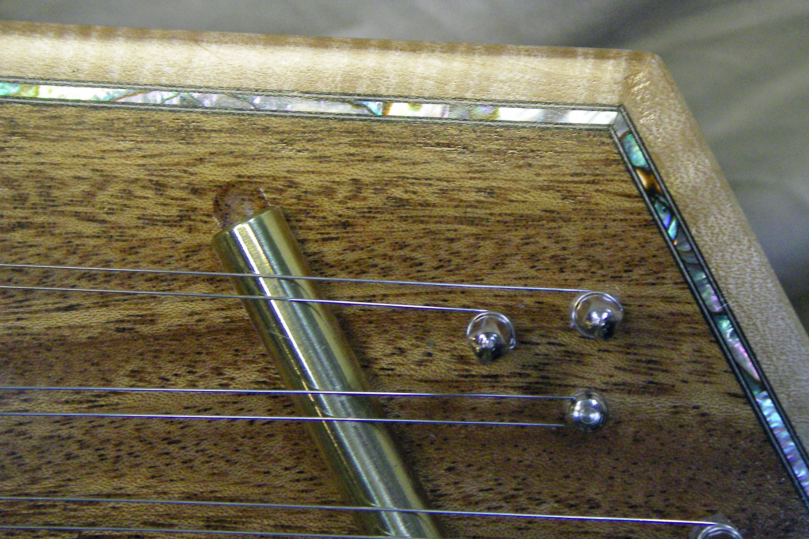 Abalone Shell And Black and White Banding Inlayed Around The Primeter Of The Dulcimer.